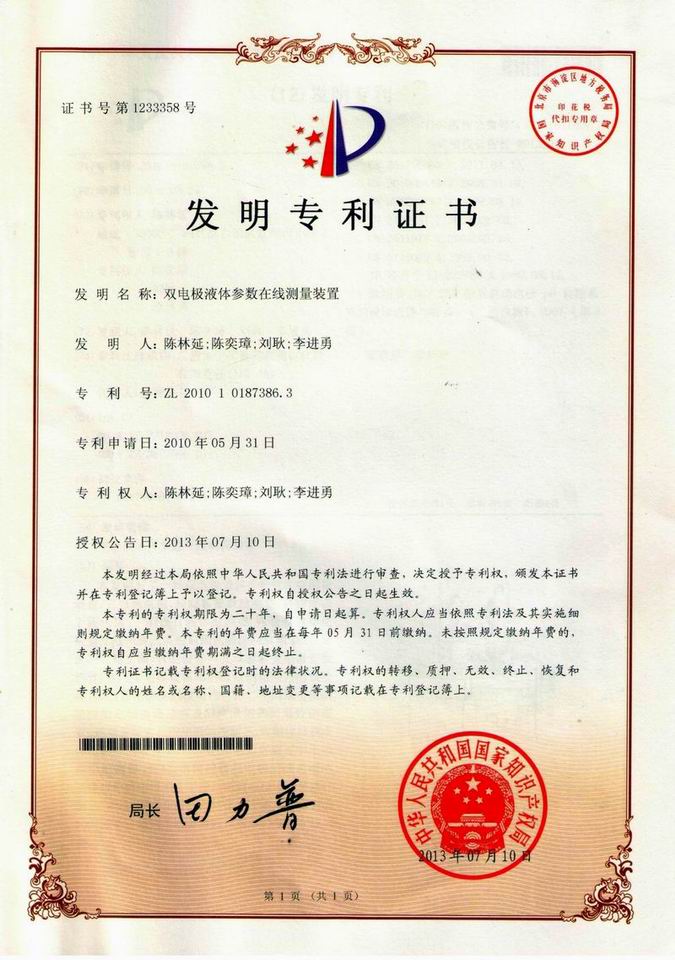 本發(fā)明的目的是提供一個(gè)雙電極液體多參數(shù)在線測量裝置,結(jié)構(gòu)簡單,工作可靠和使用方便,能同時(shí)檢測多個(gè)液體的相關(guān)參數(shù),自動(dòng)清洗電極表面,提高檢測精度。我司著重加大對(duì)科研的投入力度,積極開展技術(shù)創(chuàng)新工作,通過多年來的努力,公司獲得國家專利授權(quán)多項(xiàng),其中發(fā)明專利2項(xiàng),實(shí)用新型專利4項(xiàng),在審的發(fā)明專利3項(xiàng)。