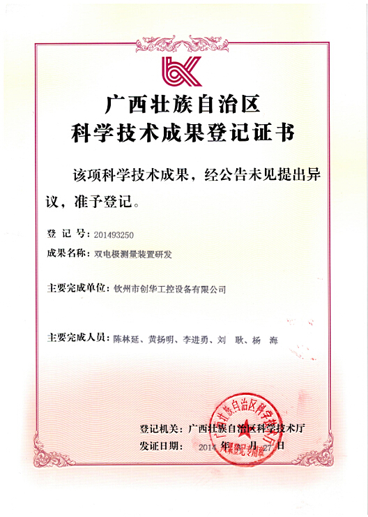 2014年1月20日,欽州市科學(xué)技術(shù)局組織有關(guān)專家對欽州市創(chuàng)華工控設(shè)備有限公司所承擔(dān)的“雙電極測量裝置研發(fā)”進(jìn)行項(xiàng)目成果鑒定,鑒定委員會(huì)專家查閱了相關(guān)材料,聽取了承擔(dān)單位項(xiàng)目介紹,進(jìn)行了質(zhì)疑答辯,經(jīng)過認(rèn)真討論認(rèn)為本項(xiàng)目利用高新技術(shù)改造傳統(tǒng)制糖產(chǎn)業(yè),有利于促進(jìn)我國制糖行業(yè)的技術(shù)裝備水平的提升,研究成果達(dá)到了國內(nèi)領(lǐng)先水平。