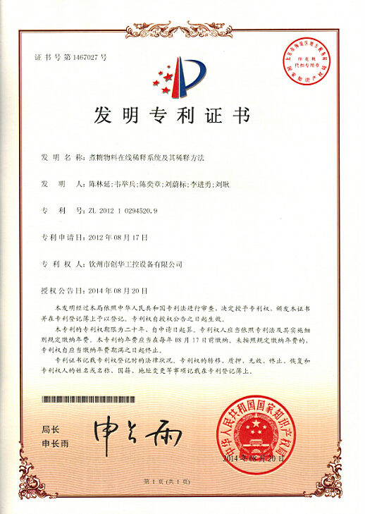 2014年8月20日,我公司自主研發(fā)的“煮糖物料在線稀釋系統(tǒng)”榮獲國家發(fā)明專利授權(quán)。截止目前,我公司已獲國家發(fā)明專利授權(quán)3項,實用專利授權(quán)5項。